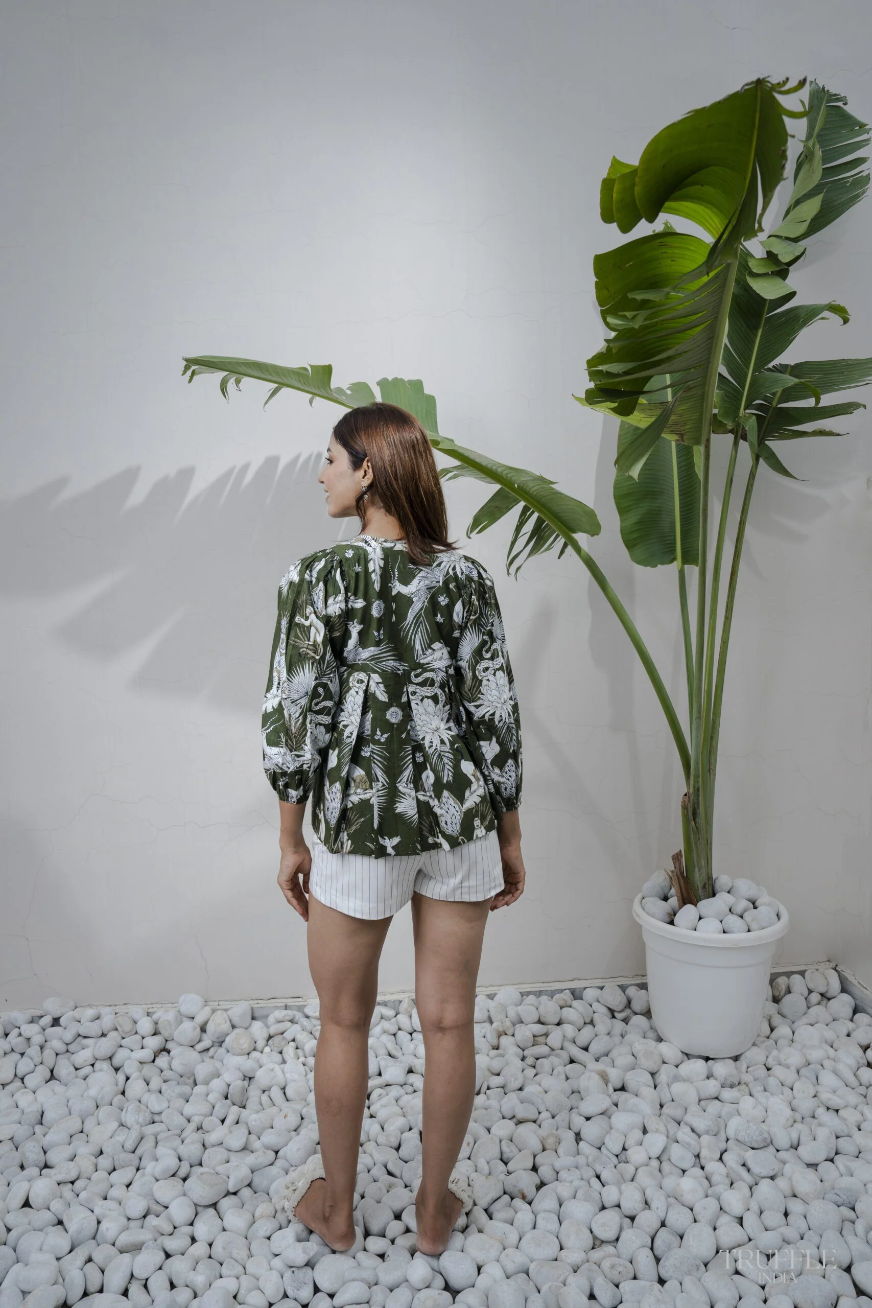 This exquisite Top is a tribute to the enchanting wonders of the jungle, where monkeys swing from branches, tigers roam with a crown of authority, and birds soar through the sky, creating a captivating masterpiece that is both regal and untamed.